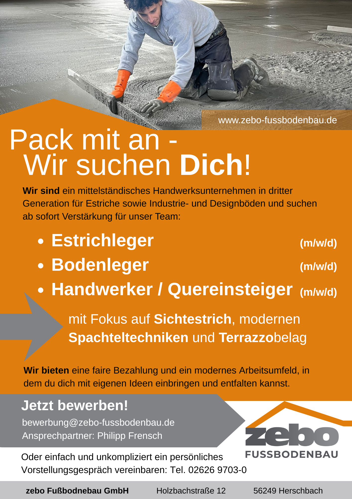 zebo Fußbodenbau GmbH ist ein mittelständisches Handwerksunternehmen mit 2 Standorten innerhalb Deutschlands. Das Leistungsprogramm umfasst das komplette Spektrum des Fußbodenbaus - von Estrich und Industrieestrich über Designböden (Unikatböden) und Bodenbeschichtungen bis hin zu Bodenbelägen in allen möglichen Ausführungen.